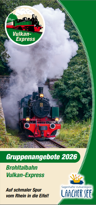 • Wir bieten Ihnen als Reisegruppe besondere Pauschalen und Kombiangebote. Verbinden Sie eine Fahrt im "Vulkan-Expreß" mit einer Rheinschifffahrt oder einem Besuch im Kloster Maria Laach bzw. am Kaltwassergeysir bei Andernach!