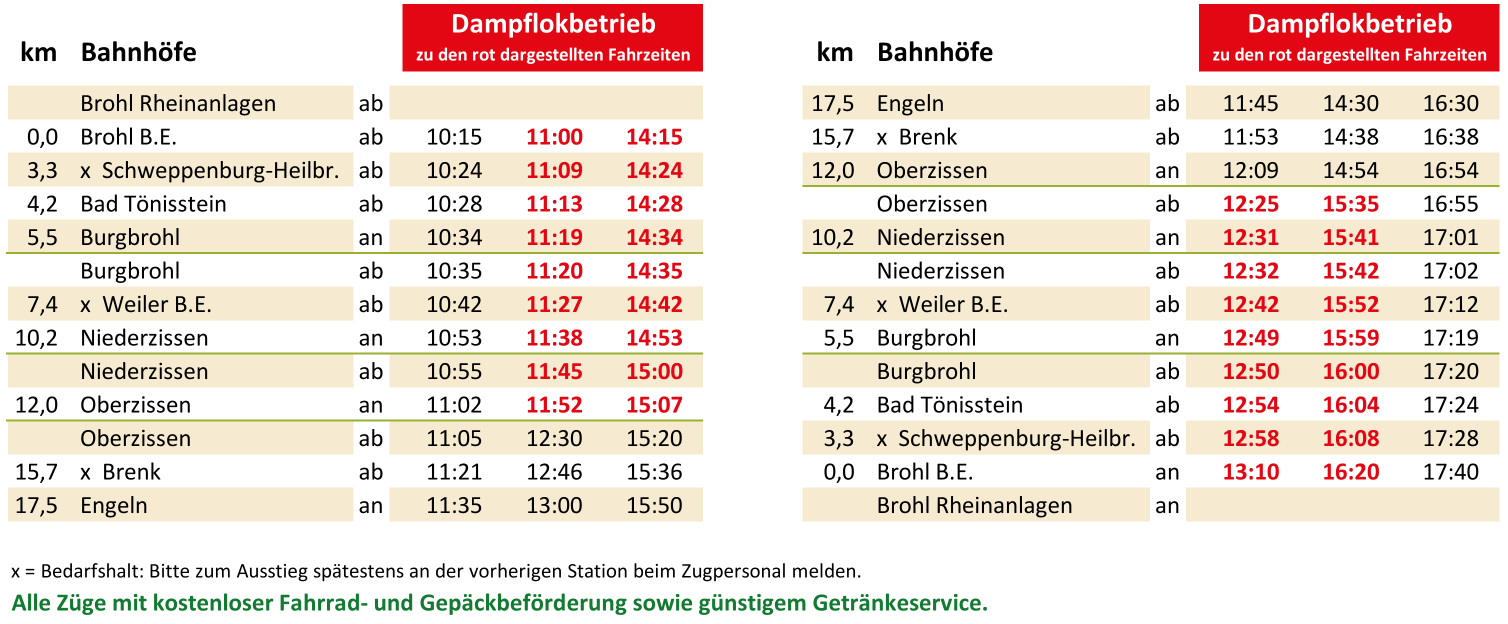 Die in untenstehendem Fahrplan schwarz gedruckten Züge werden heute von einer historischen Diesellokomotive gezogen. Die rot dargestellten Züge verkehren mit unserer 120 Jahre alten Dampflokomotive 11sm. Alle Züge führen planmäßig die 1. und 2. Klasse. Bei gutem Wetter können Sie die Fahrt in den Dampfzügen auch vom offenen Cabrio-Waggon aus genießen. Die Züge sind zu familienfreundlichen Preisen bewirtschaftet!