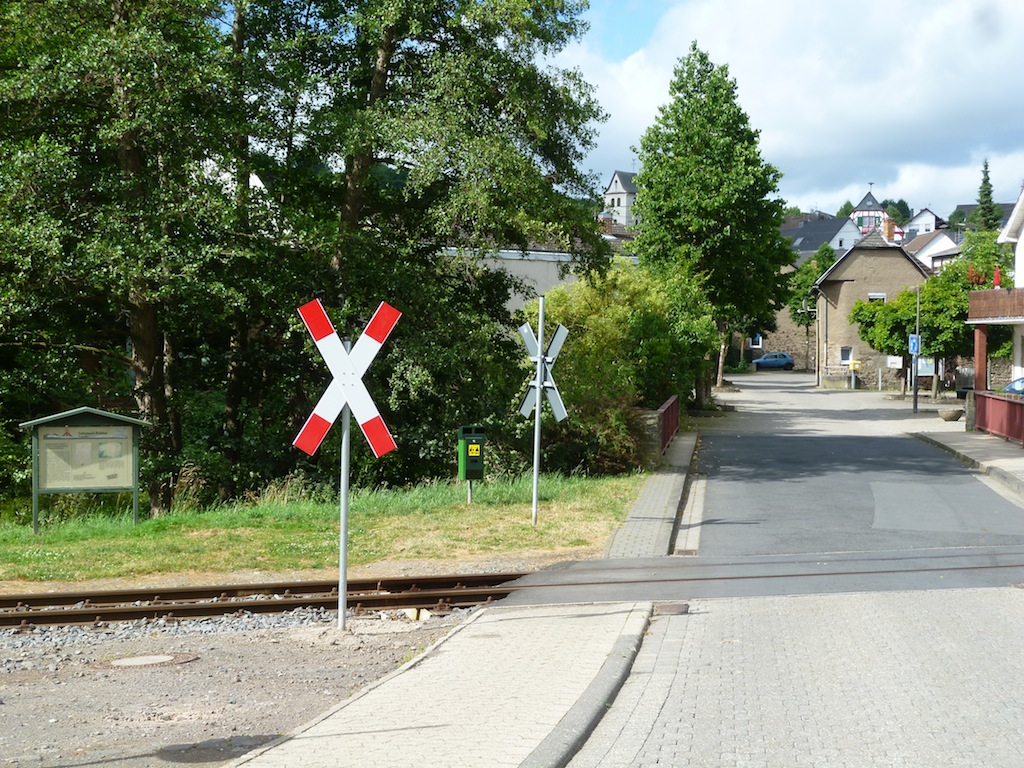 The platform at Oberzissen station can be reached from Lindenstraße and the parking lot via an bumpy gravel path. The platform is accessed by crossing a rail track at same level. There is no seating available. The toilets in the neighboring ice cream cafe can be reached via 1-2 steps (no wheelchair access). Platform surface: grit / gravel. There are 3 steps to be overcome when boarding the train.