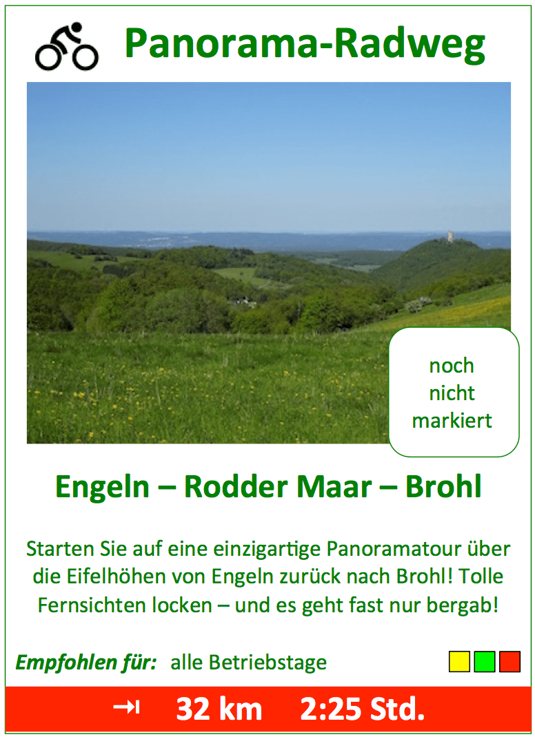 Besonders vorteilhaft ist für Radfahrer die Bergfahrt mit dem „Vulkan-Express" vom Rhein bis zur 459 Meter hoch gelegenen Endstation Engeln auf den Eifelhöhen. Den Höhenunterschied von ca. 400 Metern übernimmt der Zug, von Engeln geht es dann auf dem Fahrrad bequem bergab. Dabei können Sie aus verschiedenen Tourenempfehlungen zurück zum Rhein oder gar zur Mosel auswählen.