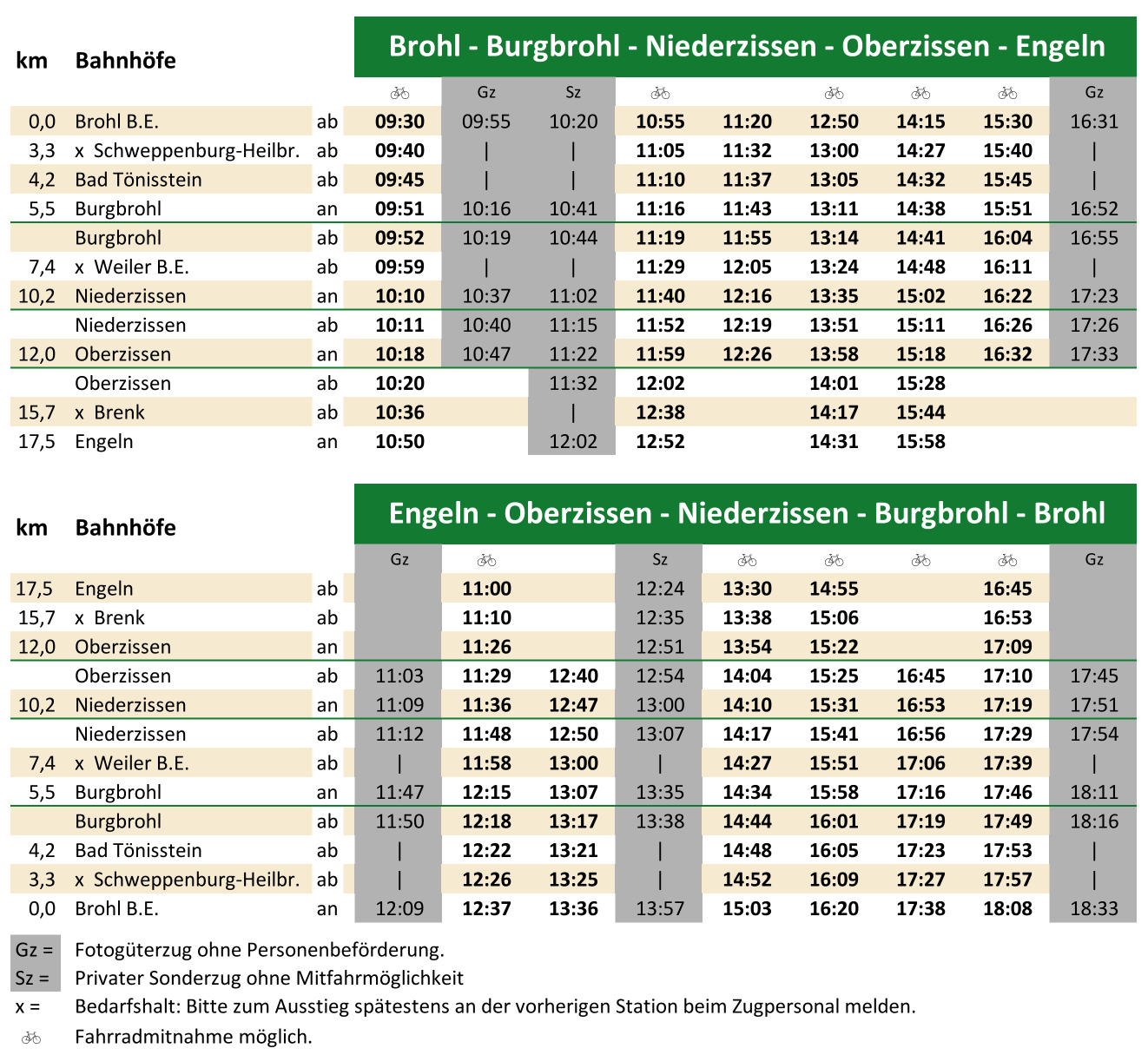 Der "Vulkan-Express" bietet heute zahlreiche Zugfahrten zwischen Brohl-Lützing am Rhein, Oberzissen und Kempenich-Engeln auf der Eifelhochfläche an. Dabei wird ein Tunnel durchfahren, mehrere Viadukte überquert und unsere Steilstrecke befahren - vom Rhein bis in die Eifel werden knapp 400 Höhenmeter überwunden! Die Züge werden heute von wechselnden Dampf- und Diesellokomotiven gezogen. Highlight ist neben unserer Mallet-Dampflokomotive 11sm der Einsatz der 1899 in Betrieb genommenen Gastlokomotive "Rur" der Selfkantbahn. Bei gutem Wetter können Sie die Fahrt in einzelnen Zügen auch vom offenen Cabrio-Waggon aus genießen. Viele Züge sind zu familienfreundlichen Preisen bewirtschaftet! Die Fahrradbeförderung ist in den markierten Zügen kostenlos möglich. Zusätzlich zu den zahlreichen Personenzügen sind heute auch sogenannte Fotogüterzüge für Sie im Brohltal unterwegs, die an den einst umfangreichen Güterverkehr auf der Brohltalbahn erinnern. An allen Bahnhöfen beginnen gut beschilderte Wanderwege. Der Endbahnhof Engeln ist zudem Ausgangspunkt für überwiegend talwärts führende Radtouren oder für Kombitouren zu weiteren touristischen Highlights in der Region. Ausgewählte Ausflugstipps finden Sie am Ende dieser Seite sowie unter "Tagestouren & Ausflüge". FahrplanTagesaktuelle Tipps