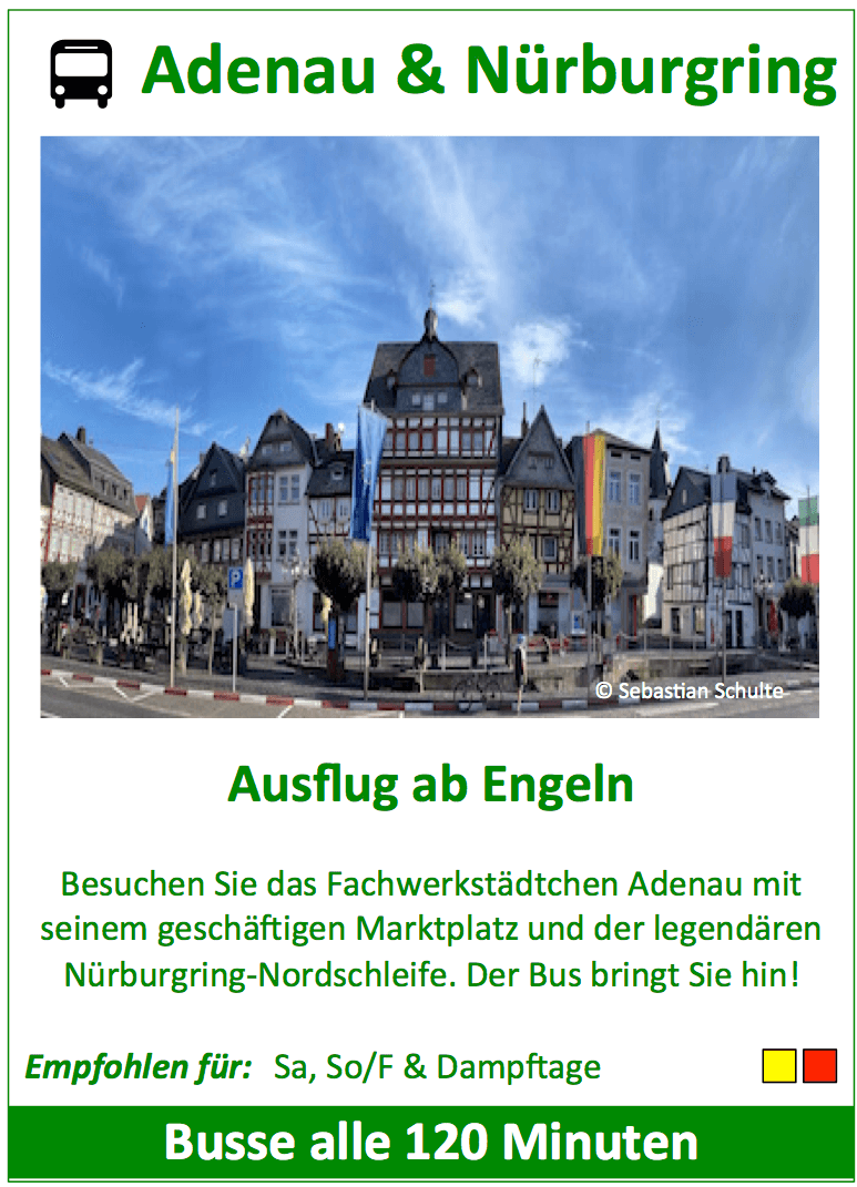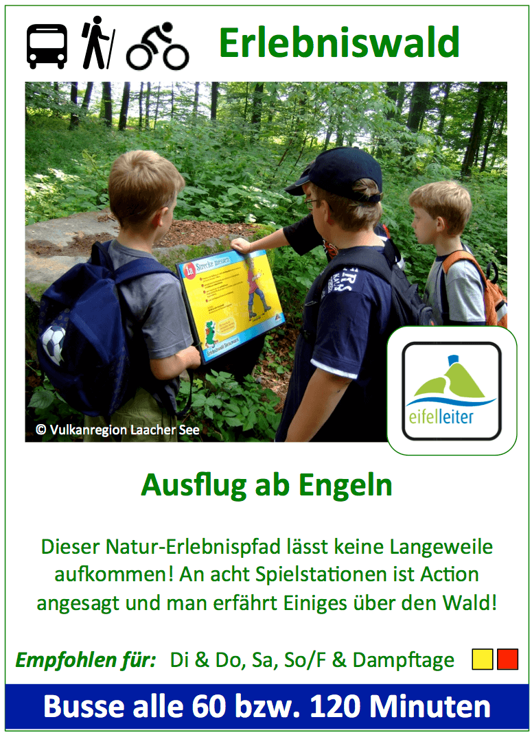 Der Freizeitbus Vulkanpark (Linie 322) bindet unseren Bahnhof Engeln am Wochenende stündlich und unter der Woche meist alle zwei Stunden direkt an viele Ausflugsziele an. In Kombination mit weiteren Linien, z.B. dem Doppeldecker-Freizeitbus 399 erreichen Sie fast jedes beliebige Ziel in der Umgebung.