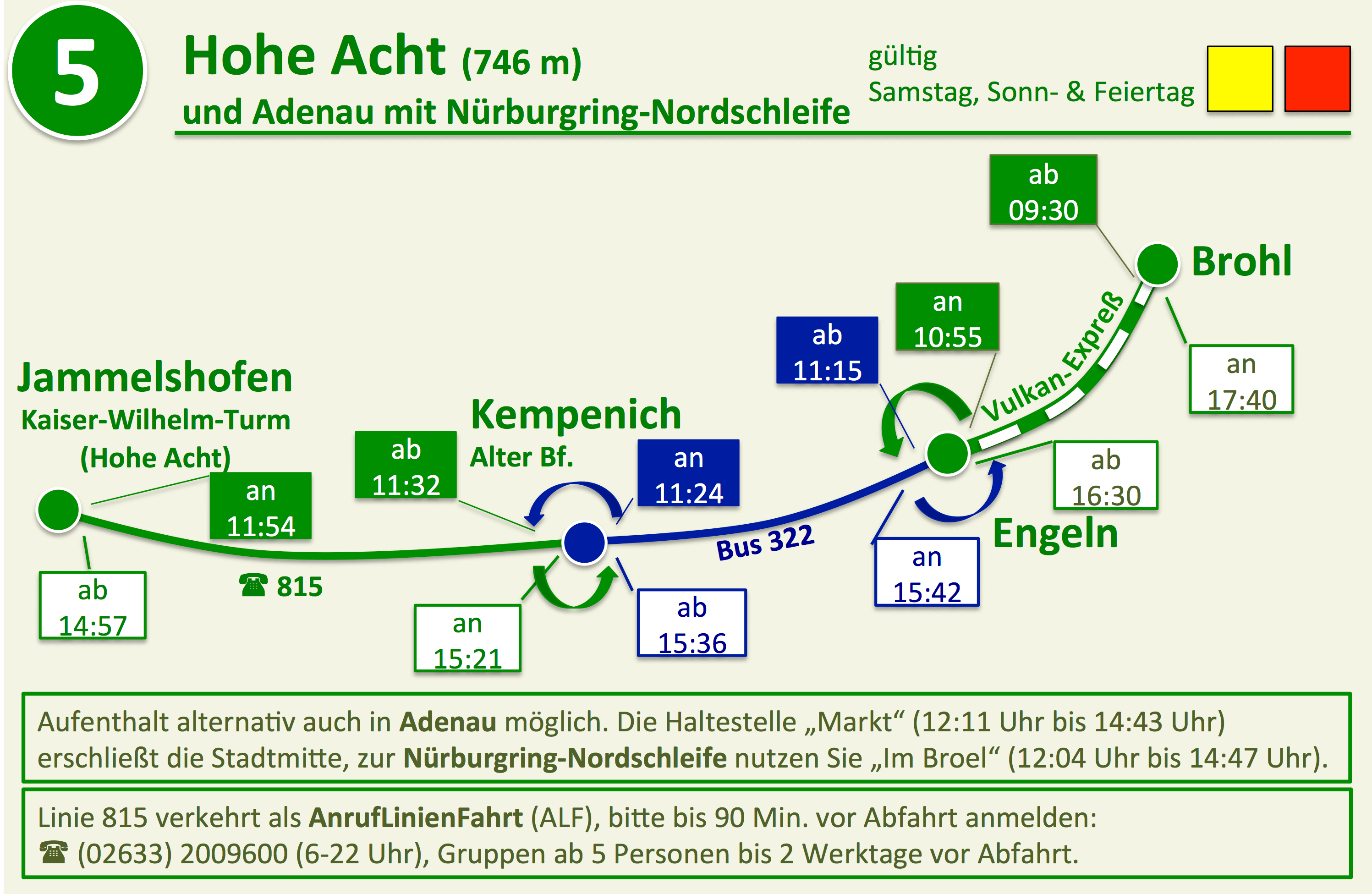 Der "Freizeitbus Vulkanpark" (Linie 322) bringt Sie vom Bahnhof Engeln stündlich stündlich nach Kempenich. Dort haben Sie alle zwei Stunden direkten Anschluss zur Anruflinie 815 bis zur Hohen Acht. Bitte melden Sie Ihre Fahrt spätestens 90 Minuten vor der Abfahrt an, Kontaktdaten siehe im Tourenvorschlag rechts. Zielhaltestelle: Jammelshofen Kaiser-Wilhelm-Turm.