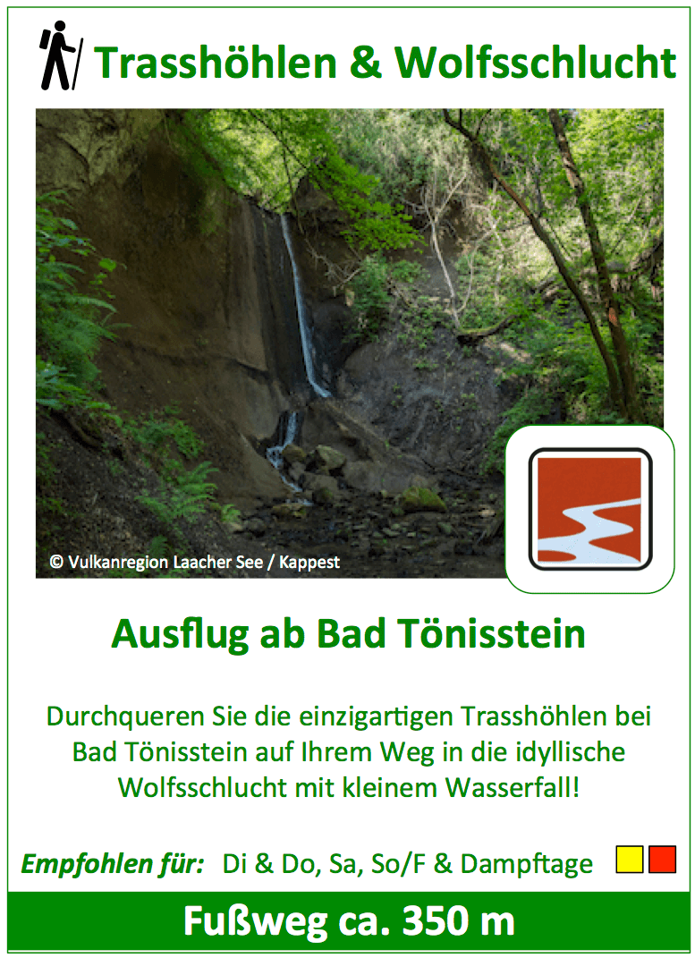 So manches attraktive Ziel liegt nicht weit von unserem Schienenstrang entfernt. Andere lassen sich perfekt mit einer kurzen Wanderung verbinden. Mit den Freizeitbussen erreichen Sie vom Bahnhof Engeln schließlich auch spannende Highlights im etwas weiteren Umfeld - stets mit Anschluss zum "Vulkan-Express", versteht sich. Nicht jedes Ziel eignet sich an all unseren Fahrtagen gleich gut für einen Besuch. Die jeweilige Empfehlung kennzeichnet, wann das Ziel besonders gut zu unserem Fahrplan passt. Weitere Details öffnen sich bei einem Klick auf das jeweilige Ziel!