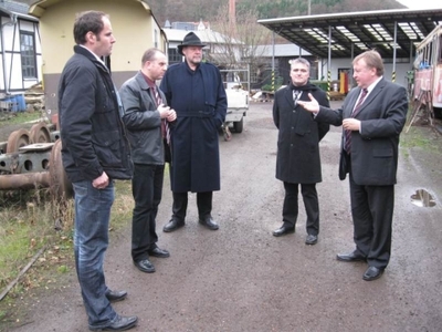 Landrat Dr. Jürgen Pföhler und Verbandsbürgermeister Johannes Bell informieren sich vor Ort über den Baufortschritt am 12.11.2009. Das Foto zeigt die Teilnehmer bei der Vorabinformationen im Hof der Werkstatt mit Alexander Bell, Verbandsbürgermeister Johannes Bell, Thomas Bickenbach und Stefan Raab.